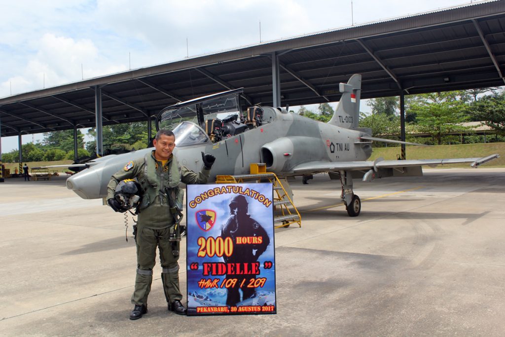 ANGKASAREVIEW.COM – Mayor Pnb Fardinal “Fidelle” Umar berhasil mencapai 2.000 jam terbang menggunakan pesawat tempur Hawk 100/200. Prestasi tersebut diraih penerbang TNI AU dari Skadron Udara 12 Lanud Roesmin Nurjadin (RSN Air Force Base) ini pada Rabu (30/8/2017).
