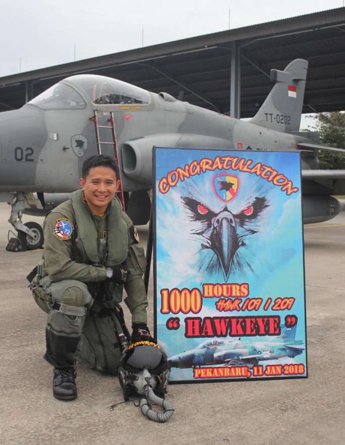 ANGKASAREVIEW.COM – Lettu Pnb Syahrevy Enrico “Hawk Eye” Dermawan dari Skadron Udara 12 Lanud Roesmin Nurjadin, Pekanbaru berhasil mencapai angka 1.000 jam terbang di pesawat tempur Hawk 109/209, Kamis (11/1/2018).