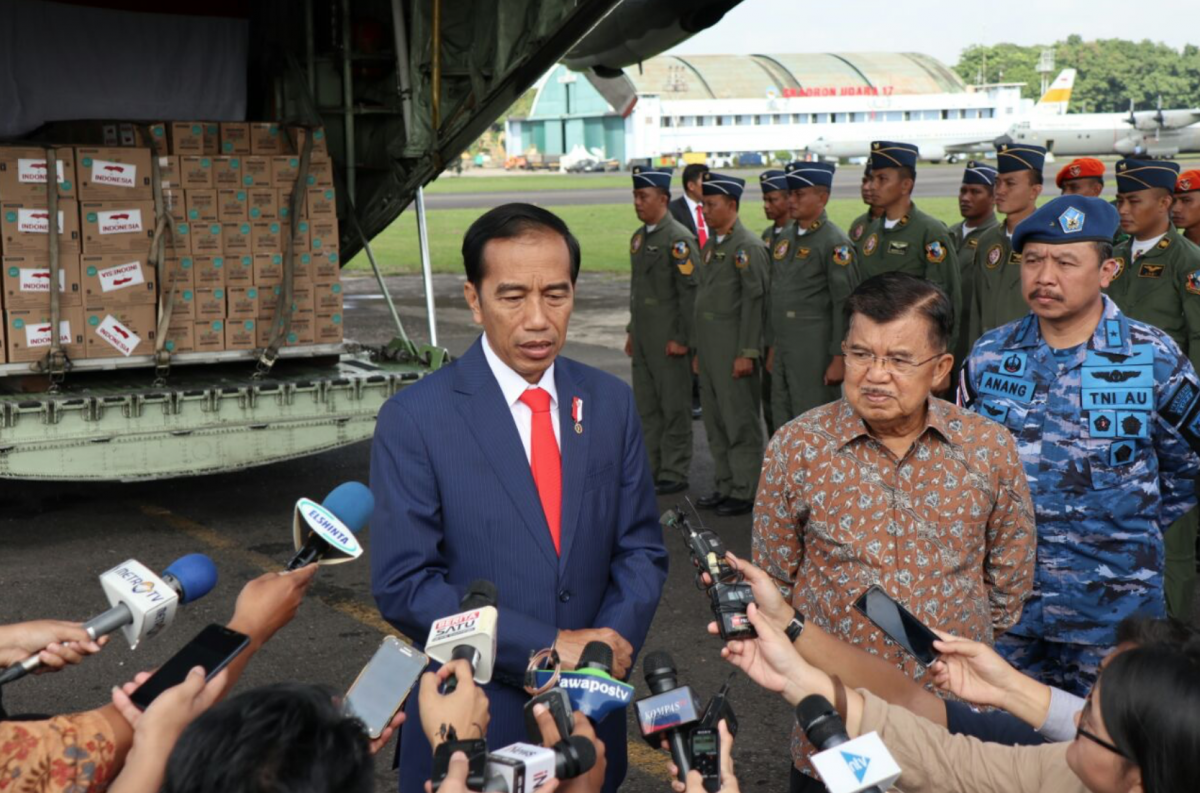 Kesiapan pemberangkatan bantuan ditinjau langsung oleh Presiden Joko Widodo dan Wakil Presiden Jusuf Kalla didampingi beberapa pejabat dari BNPB, Kemenkes, Kemensos, dan TNI AU.