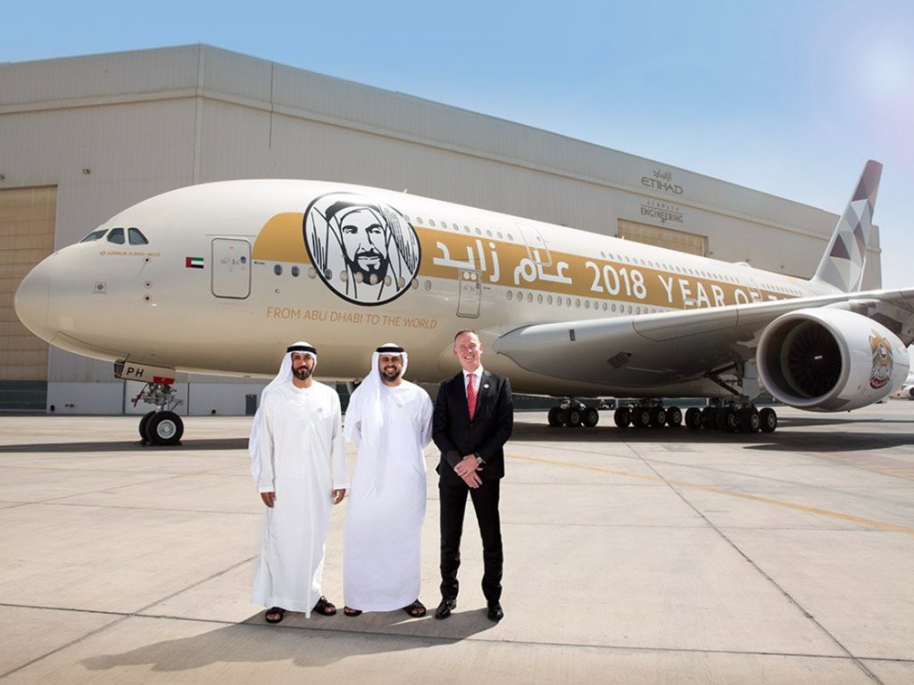 Foto Sheikh Zayed dan tulisan Year of Zayed terpampang besar di badan A380. Sementara tulisan From Abu Dhabi to The World dengan ukuran huruf lebih kecil terlihat di bawah foto Sheikh Zayed di bagian depan pesawat.