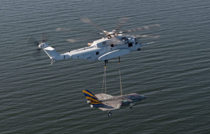 AIRSPACE REVIEW (airspace-review.com) – Sebuah helikopter angkut berat CH-53K King Stallion menjalani uji pengangkutan sebuah F-35C secara eksternal.