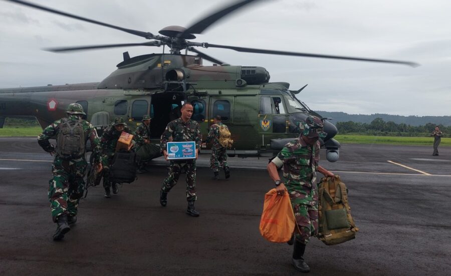 AIRSPACE REVIEW - Helikopter H-225M Caracal TNI Angkatan Udara dengan nomor registrasi H-2215 mendistribusikan bantuan untuk korban bencana banjir dan…