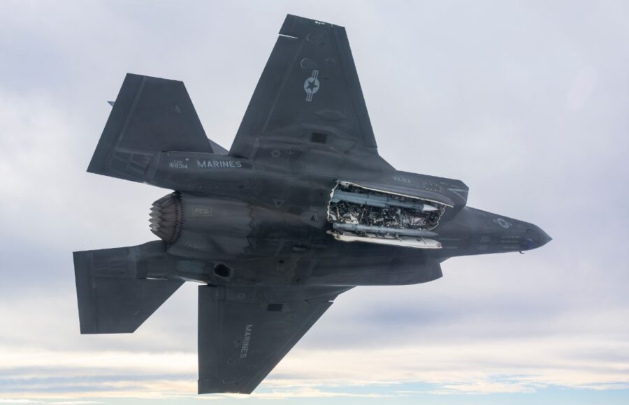 AIRSPACE REVIEW - Sebuah pesawat tempur siluman F-35B milik Korps Marinir AS (USMC) terbang di atas Pangkalan Udara Angkatan Laut…